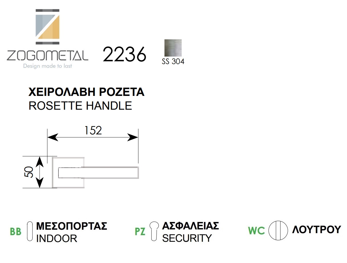 Ανοξείδωτα Πόμολα Πόρτας Χειρολαβή Με Ροζέτα Ζωγομετάλ 2236 Νίκελ Ματ