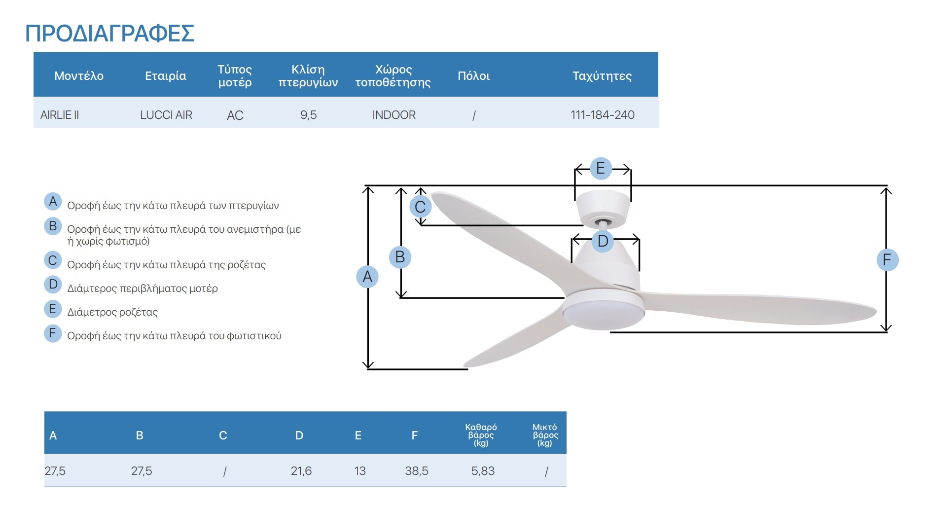 | Ύψος (Οροφή έως πτερύγια) (cm) | 27.5 |