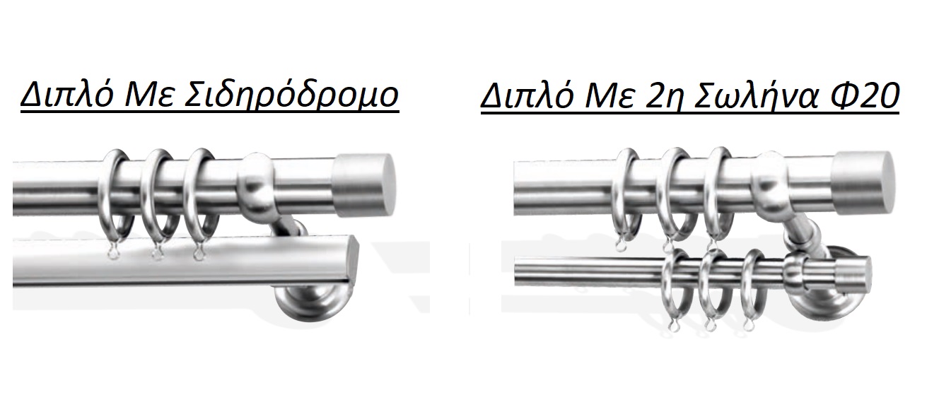 Στα διπλά κουρτινόξυλα περιλαμβάνονται επιπλέον, ο σιδηρόδρομος, δακτυλίδια προσαρμογής διπλού, κρίκοι, ταπάκια, γατζάκια