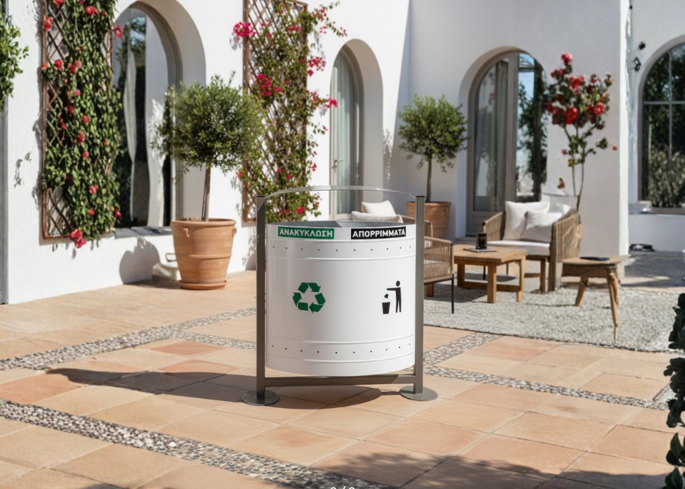 Μοντέρνος οβάλ κάδος ανακύκλωσης που συνδυάζει κομψή αισθητική και λειτουργικότητα για αποτελεσματικό διαχωρισμό απορριμμάτων σε εξωτερικούς χώρους.