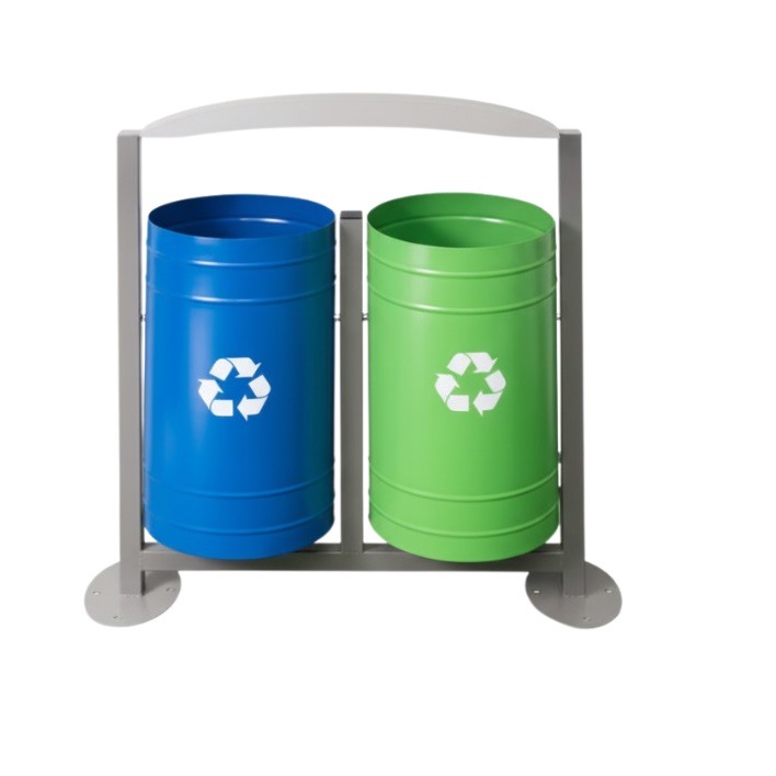 - Δύο κυλινδρικοί κάδοι σε μπλε και πράσινο χρώμα με το διεθνές σύμβολο ανακύκλωσης