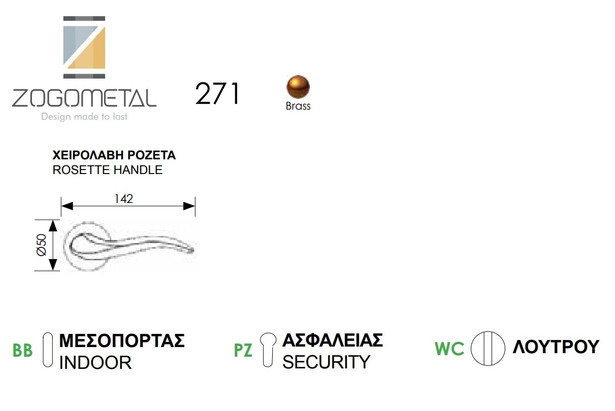 Ορειχάλκινα Πόμολα Πόρτας Χειρολαβή Με Ροζέτα Ζωγομετάλ 271 Ορο Ματ