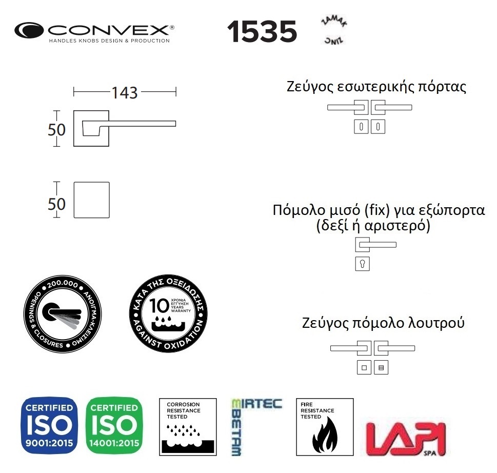 Εγγύηση: Η Convex παρέχει εγγύηση για τον μηχανισμό των πόμολων θυρών σε 200.00 φορές άνοιγμα κλείσιμο